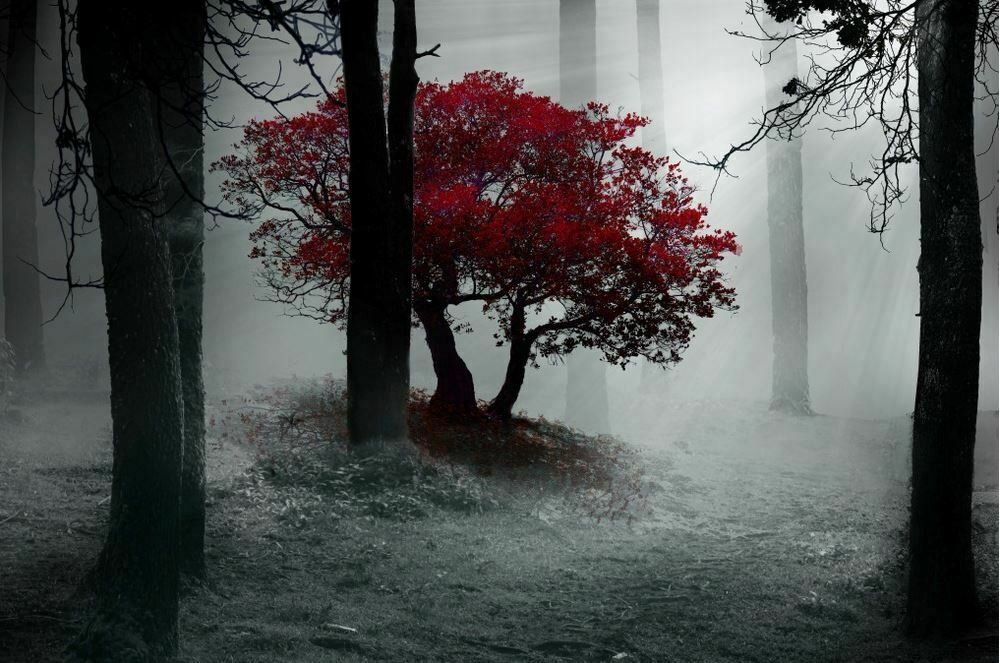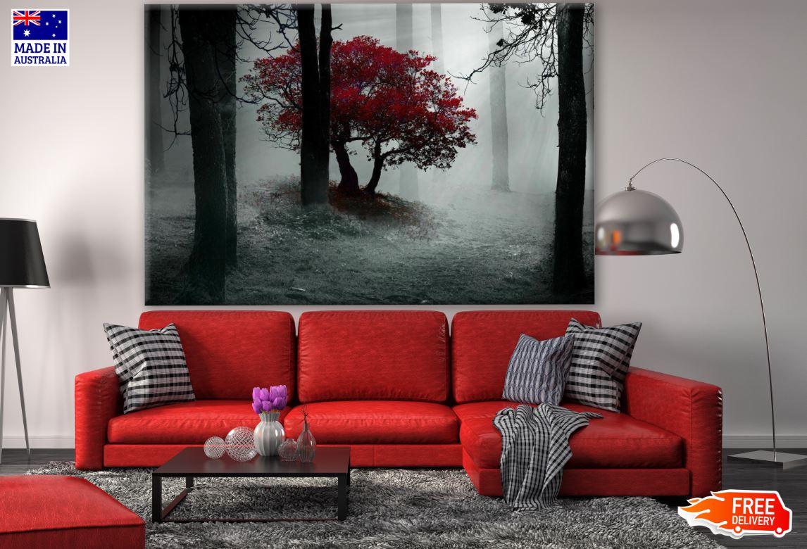 B&W Trees with Red Leaves in a Misty Forest Photograph Print 100% Australian Made