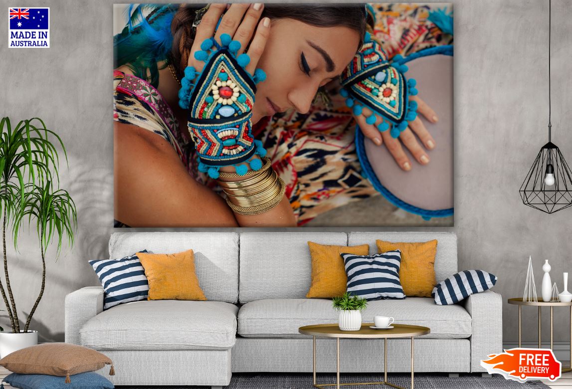 Young Woman with Jewelry, Drum & Makeup Closeup Portrait Photograph Print 100% Australian Made