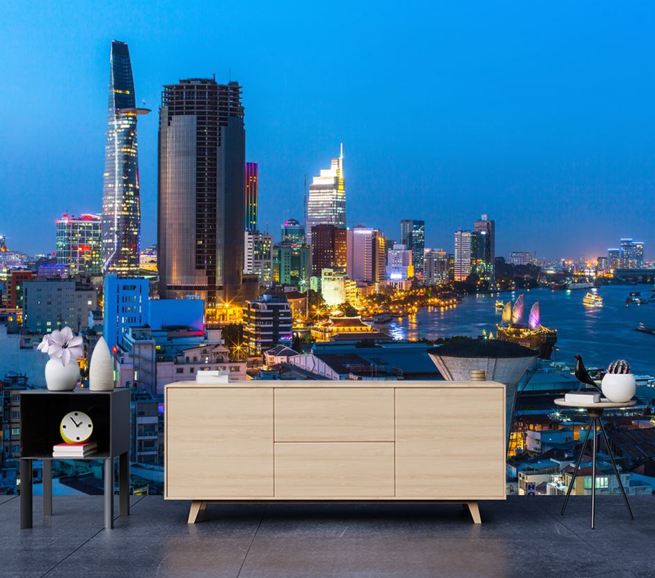 Wallpaper Murals Peel and Stick Removable Top View of Ho Chi Minh City at Night Time, Vietnam High Quality