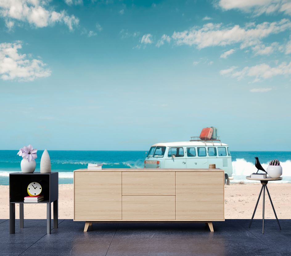 Wallpaper Murals Peel and Stick Removable Volkswagen Van on the Sea Shore High Quality
