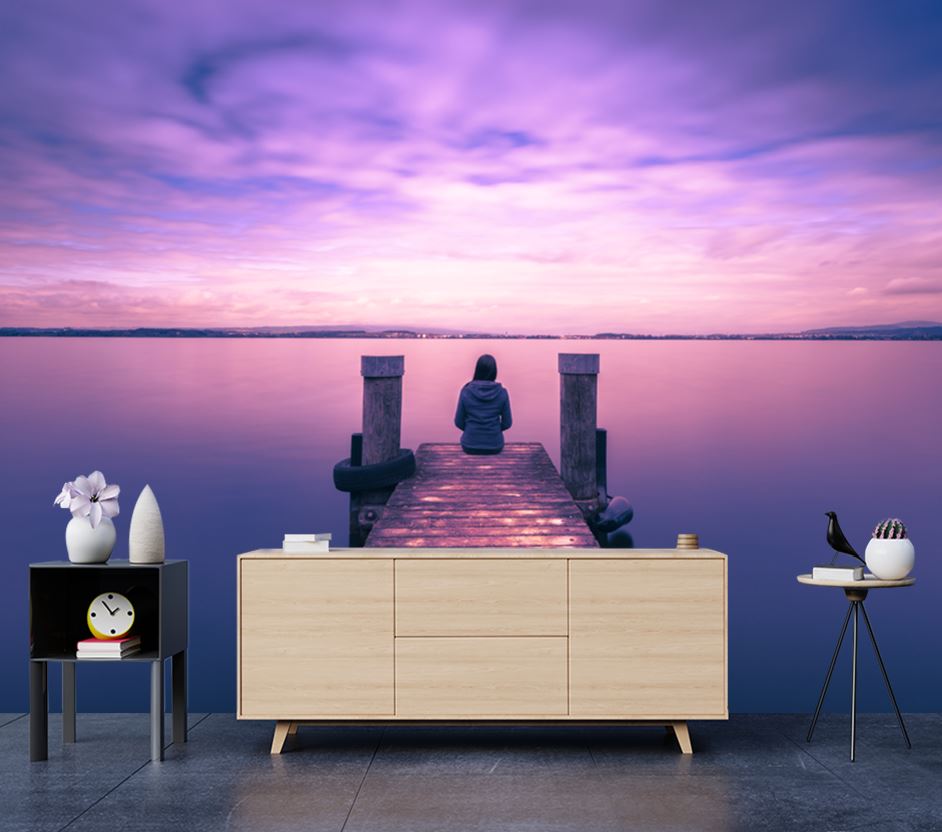 Wallpaper Murals Peel and Stick Removable Girl Sitting on Wooden Pier High Quality