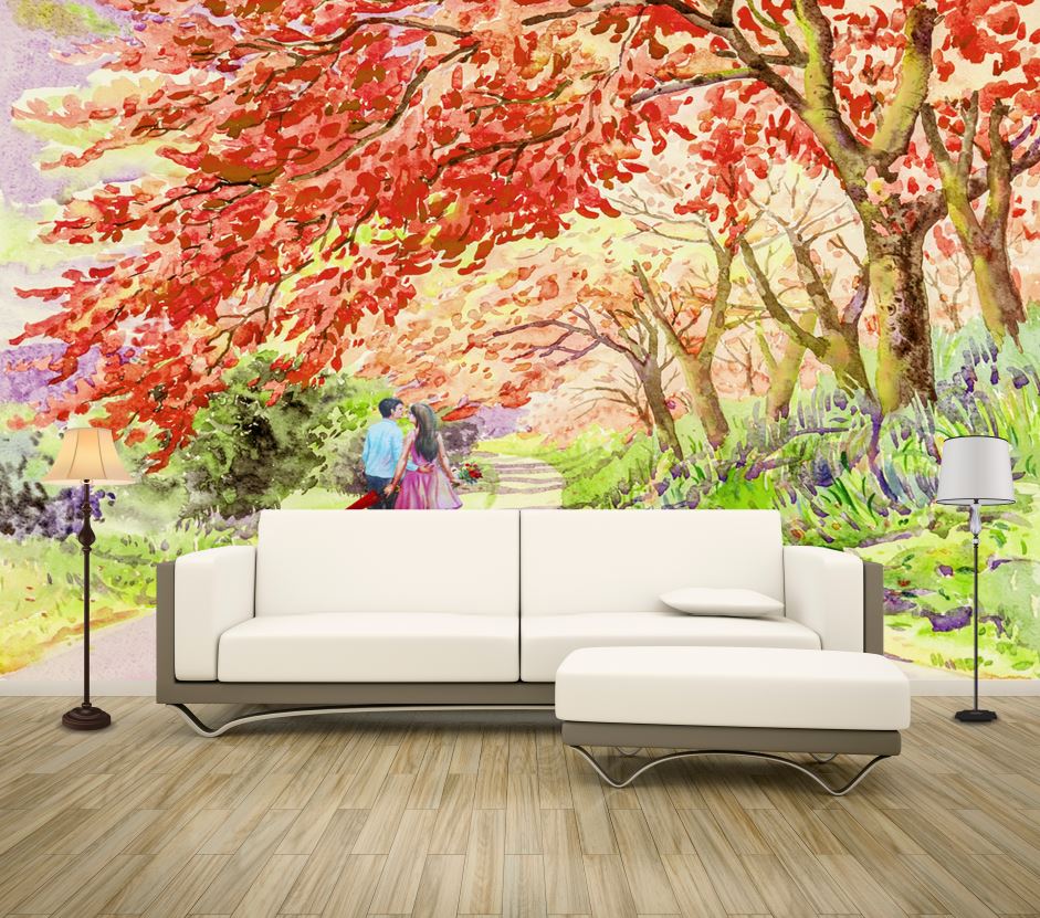 Wallpaper Murals Peel and Stick Removable Couple Walking Along a Tree Road Painting High Quality