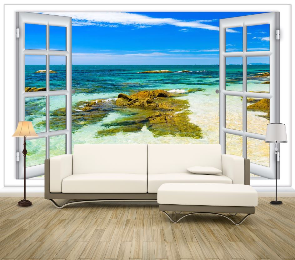 Wallpaper Murals Peel and Stick Removable Stunning Beach View through Window High Quality