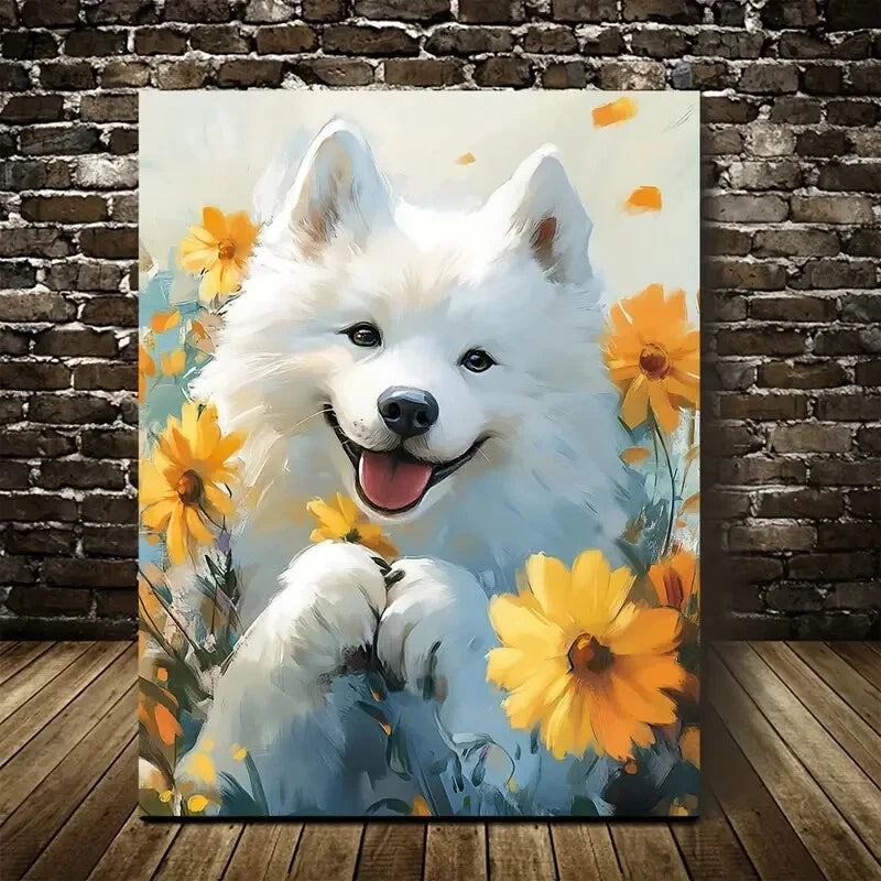 Cute Samoyed Dog with Flowers Painting 40x60cm Metal Print Ready to Hang