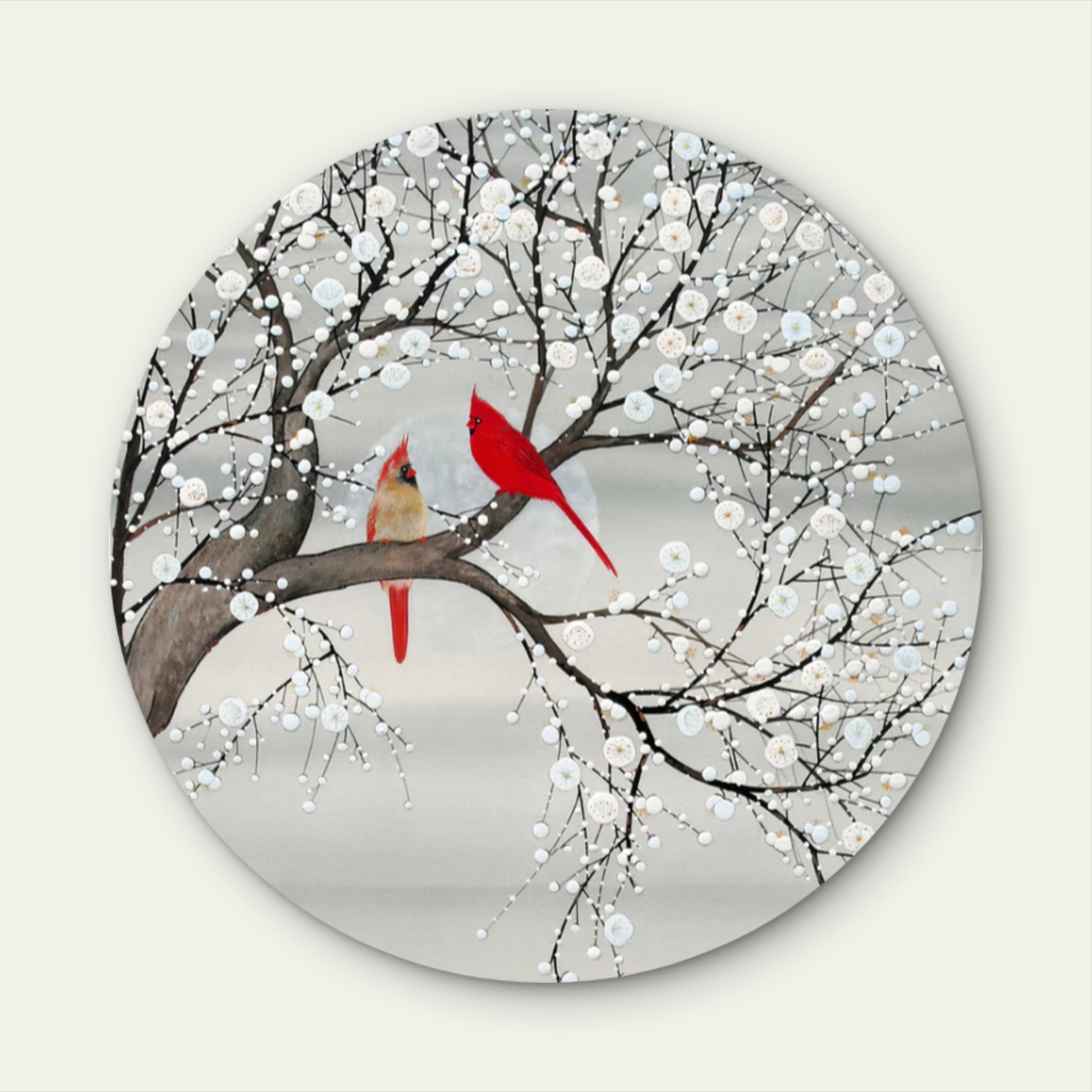 Grey White Flower Blossoming Red Bird Couple Acrylic Glass Rounded Print Tempered Glass Wall Art 100% Made in Australia Ready to Hang