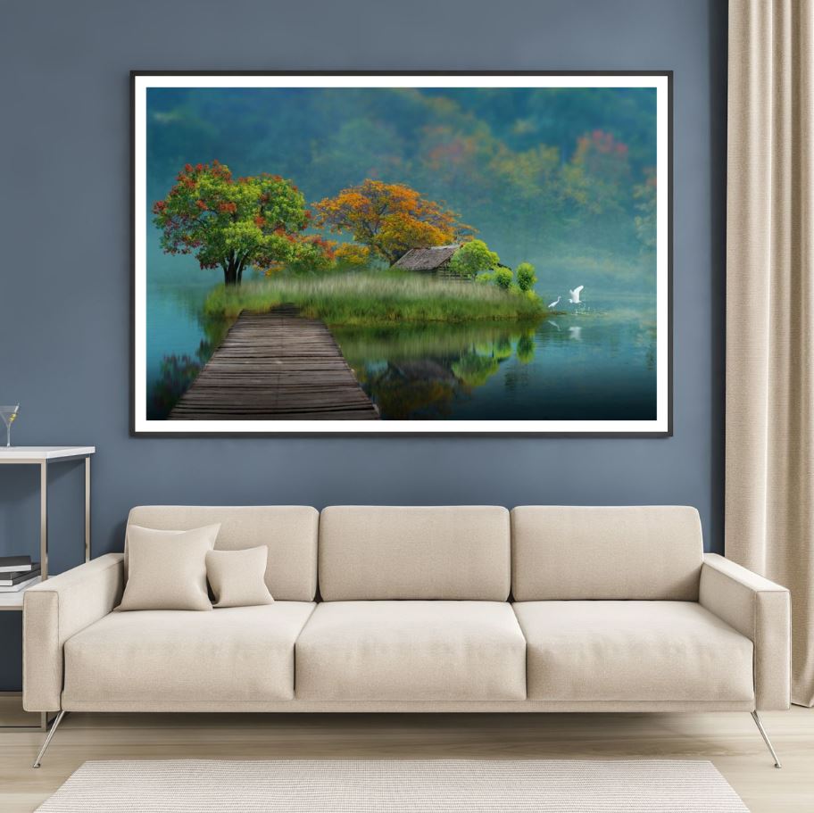 Wooden Pier to an Island in Lake Photograph Home Decor Premium Quality Poster Print Choose Your Sizes