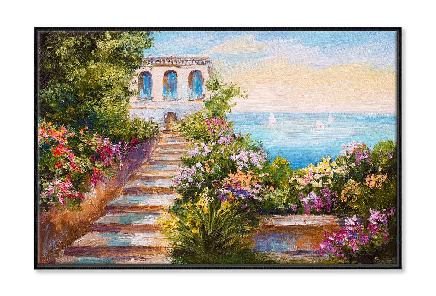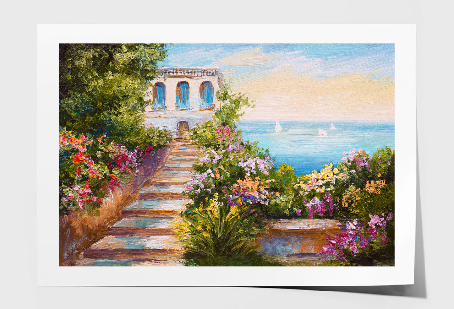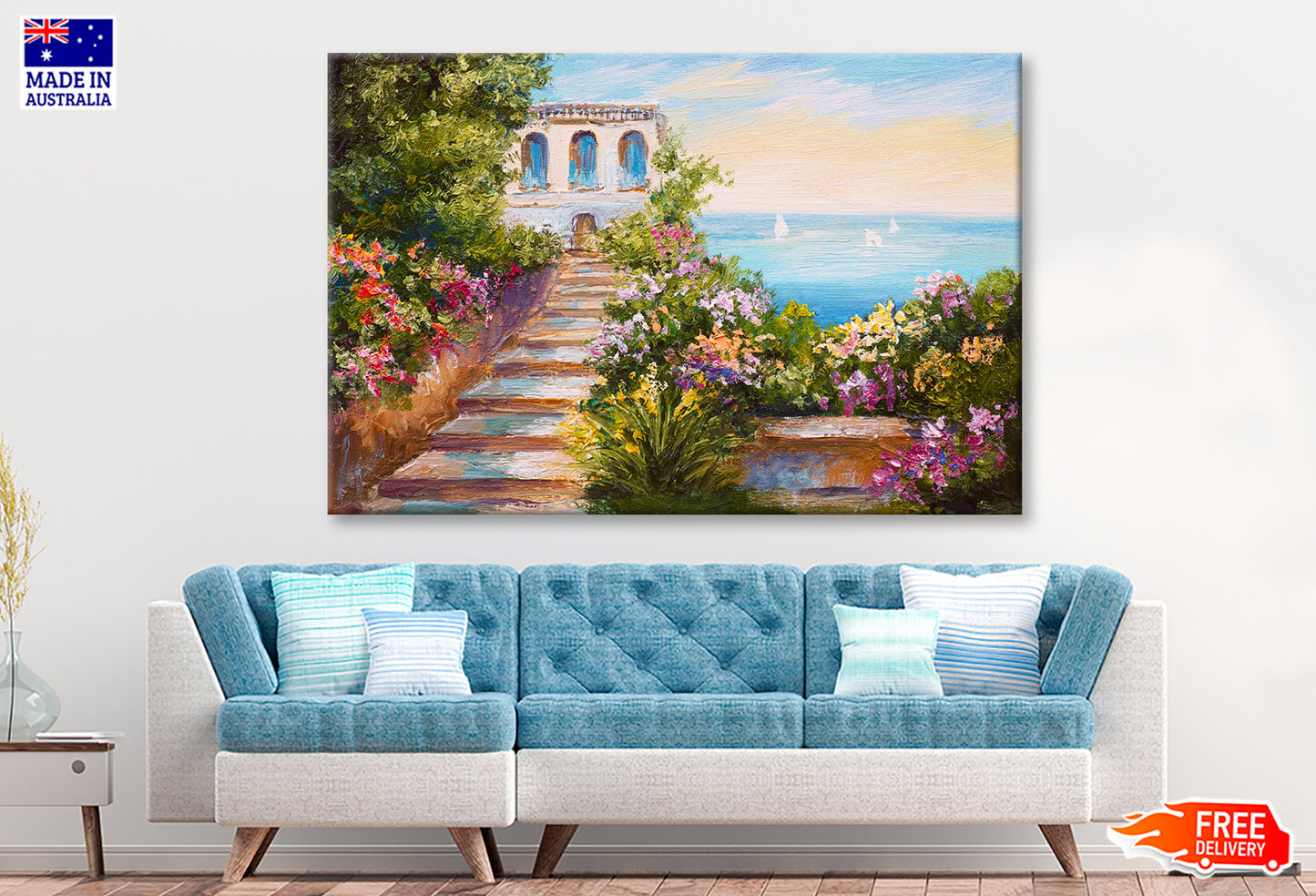 House near the Sea & Colorful Flowers Oil Painting Wall Art Limited Edition High Quality Print