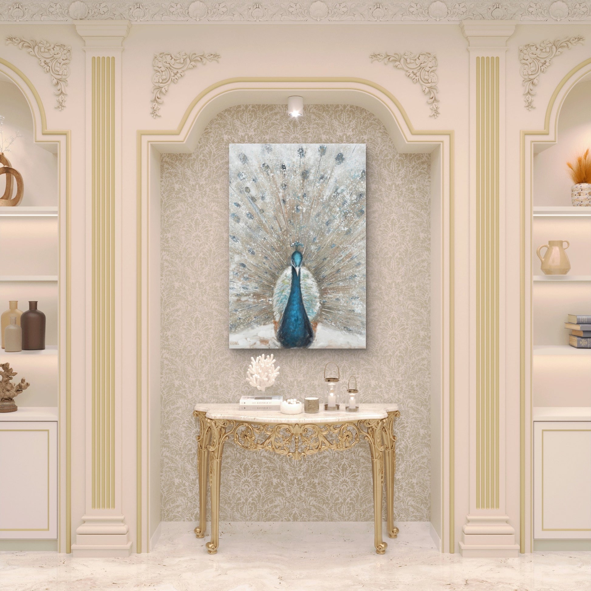 Neutral Blue Teal Peacock Feather Impression 40x60cm Metal Print Ready to Hang