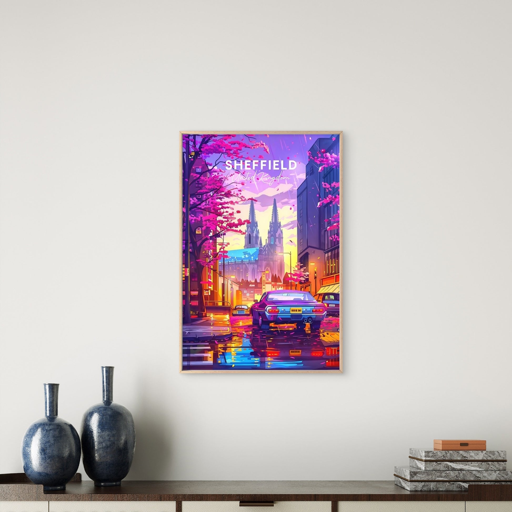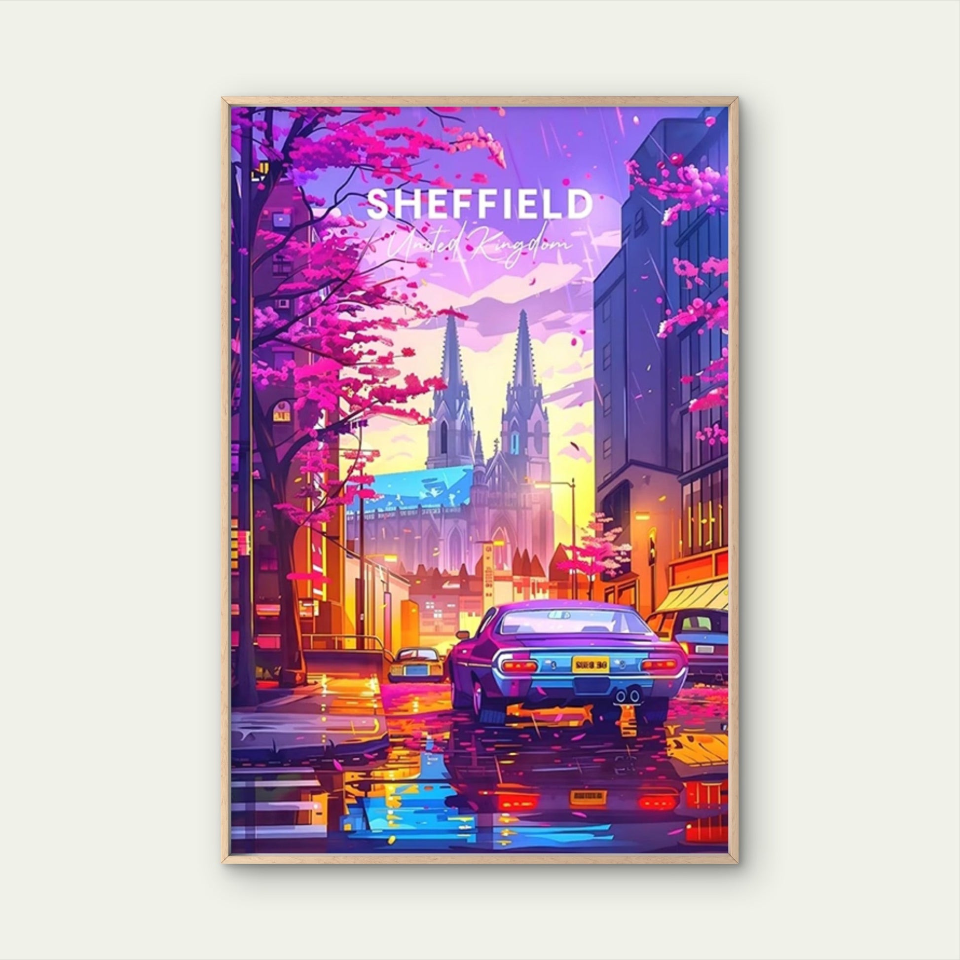Sheffield England Pink Cherry Blossom Trees Travel Poster Print Wall Art