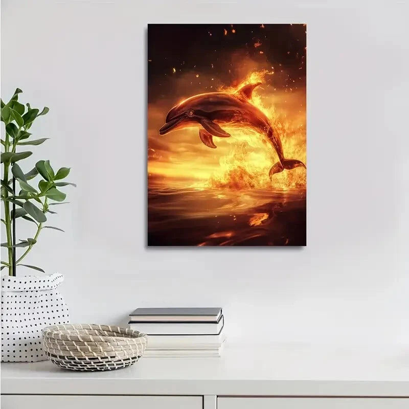 Steampunk Dolphin Sunset Scene with Glowing Painting 40x60cm Metal Print Ready to Hang